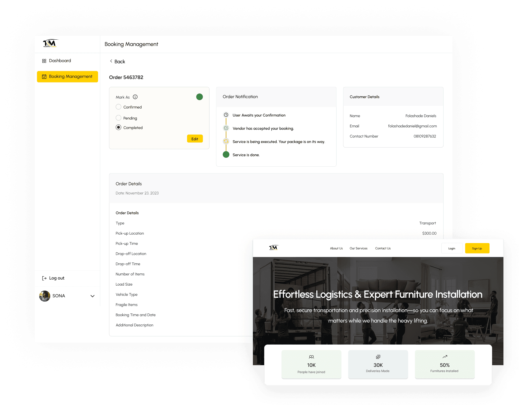 Designed a multi-service logistics solution that consolidated moving, installation, and transportation services into one intuitive digital experience. The design transformed manual, phone-based bookings into a streamlined responsive web application, reducing booking time from hours to minutes and contributing to a 60% improvement in operational efficiency.